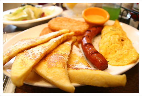 終於輪到主食, 歐姆蕾、酥炸薯餅、德國臘腸、法式煎蛋吐司, 這兒的早午餐閉著眼睛點都很好吃呢!